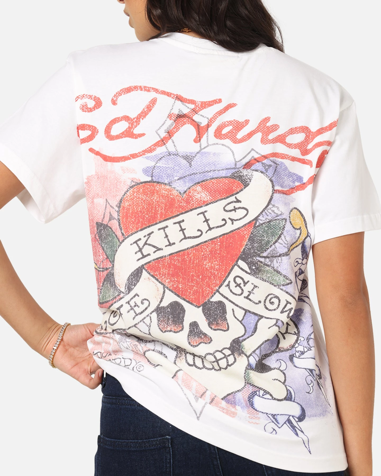Elevate your casual wardrobe with the Ed Hardy Love Kills Slowly Vintage T-Shirt —a bold blend of iconic design and top-notch comfort. This premium cotton tee features striking printed graphics that pay homage to Ed Hardy’s legendary tattoo artistry blending the laidback, streetwear vibes. Finished with twin needle stitching and a ribbed crewneck for it to outlast the rest. Make a statement and cop yours today at Culture Kings.